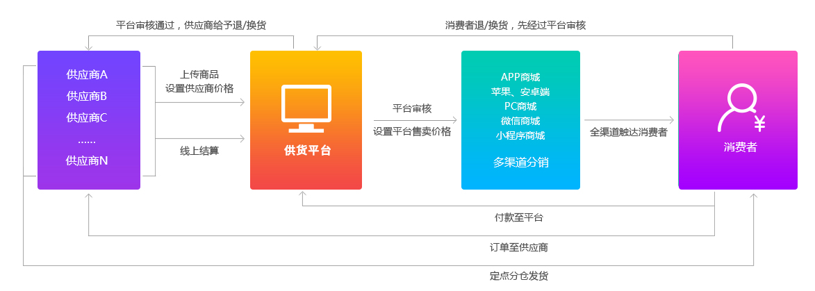 1.平台企业通过签约多方渠道供应商,通过会员、交易、平台和财务等管理系统,对平台进行运营管理。